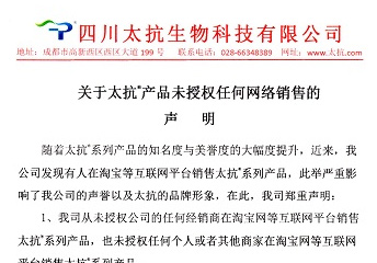 關(guān)于太抗?產(chǎn)品未授權(quán)任何網(wǎng)絡(luò)銷售的聲明發(fā)布日期:2017.05.15點(diǎn)擊量:6603
