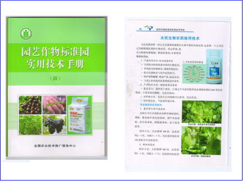 自2012年取得三證后正式推向市場(chǎng)以來(lái),由于安全可靠效果好,太抗生物農(nóng)藥能夠在供給側(cè)為健康生活提供基礎(chǔ),奠立了太抗在生物農(nóng)藥行業(yè)領(lǐng)軍前行的良好格局。由于產(chǎn)品推廣示范應(yīng)用的良好效果,太抗生物農(nóng)藥入選農(nóng)業(yè)部關(guān)于印發(fā)《農(nóng)企合作共建示范基地深入推進(jìn)<到2020年農(nóng)藥用量零增長(zhǎng)行動(dòng)實(shí)施方案計(jì)劃>實(shí)施方案》(農(nóng)農(nóng)【2015】61號(hào)),被全國(guó)農(nóng)業(yè)技術(shù)推廣服務(wù)中心編入《園藝作物標(biāo)準(zhǔn)園使用技術(shù)手冊(cè)》,也被成都市植物檢疫站編入《成都市生物農(nóng)藥應(yīng)用手冊(cè)》中第一個(gè)推薦使用的生物農(nóng)藥。
