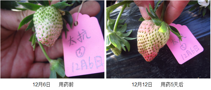 幼果期草莓用太抗后白粉菌絲逐漸減少、萎蔫