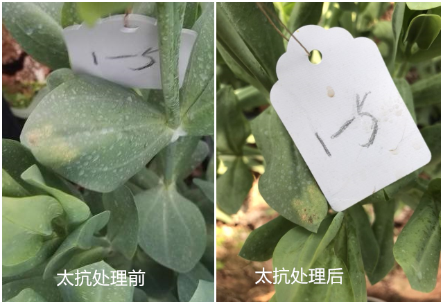 試驗(yàn)結(jié)果:太抗幾?。久快`能有效防治洋桔?;颐共?,使灰色霉層變干脫落。對(duì)照組仍有部分病斑沒(méi)有得到有效控制。