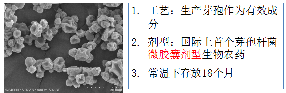 微生物包裹在微膠囊內(nèi),抗逆性強(qiáng),貨架期長,效果穩(wěn)定;克服了生物農(nóng)藥常溫下不能長期存放的技術(shù)瓶頸。