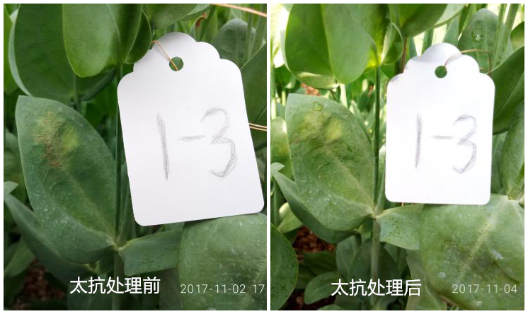 試驗(yàn)結(jié)果:太抗幾?。久快`能有效防治洋桔?;颐共?,使灰色霉層變干脫落。對(duì)照組仍有部分病斑沒(méi)有得到有效控制。