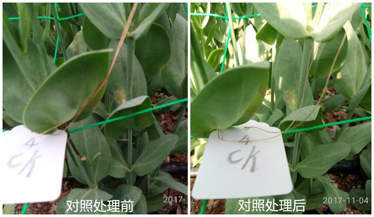 對(duì)照區(qū)經(jīng)過(guò)兩次觀察,病害控制情況不理想,依舊有部分霉層活躍未脫落。